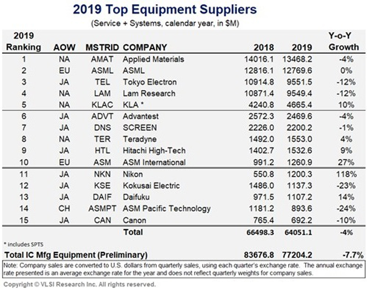 ◇2019年の半導体製造装置メーカー売上高ランキング・トップ15 単位(US $ Million)