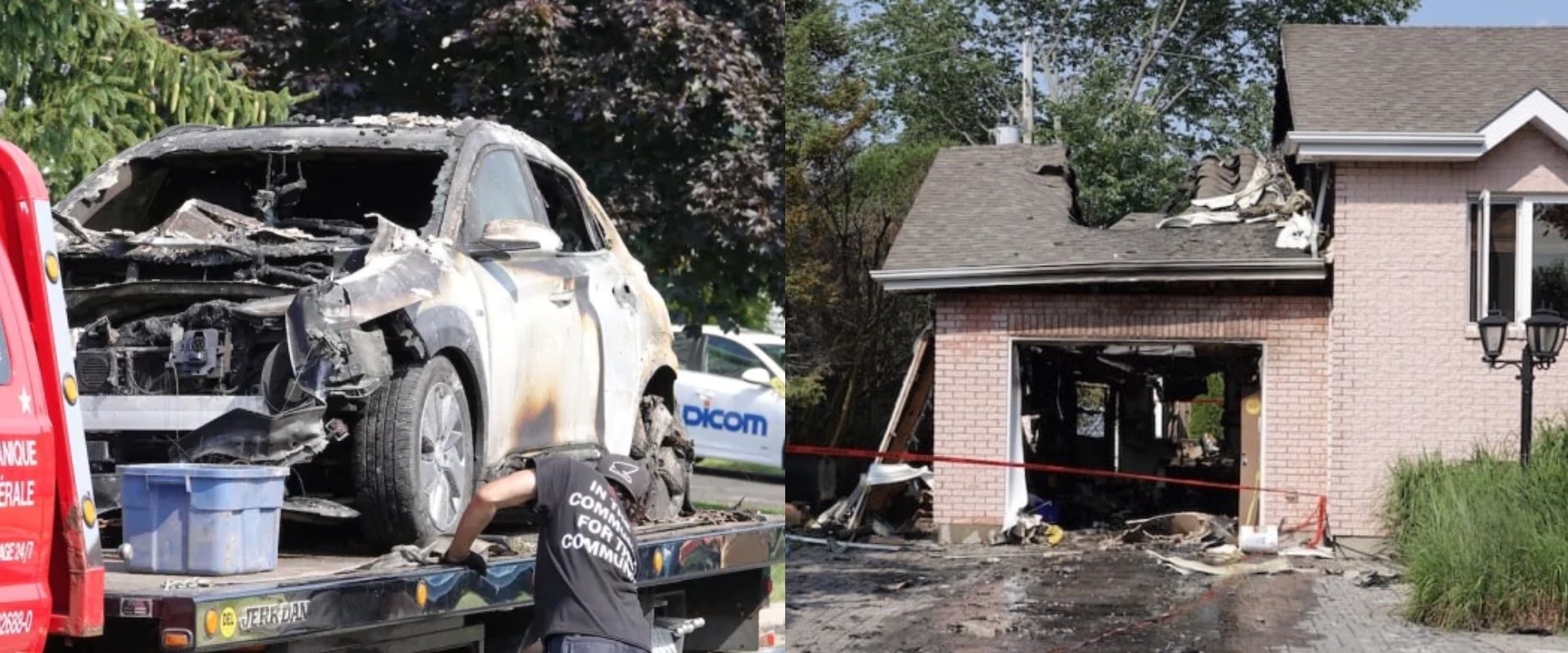 電気自動車の充電中に後部座席で火災が発生し、2人が煙を吸い、家一軒火が燃え移りもしました。