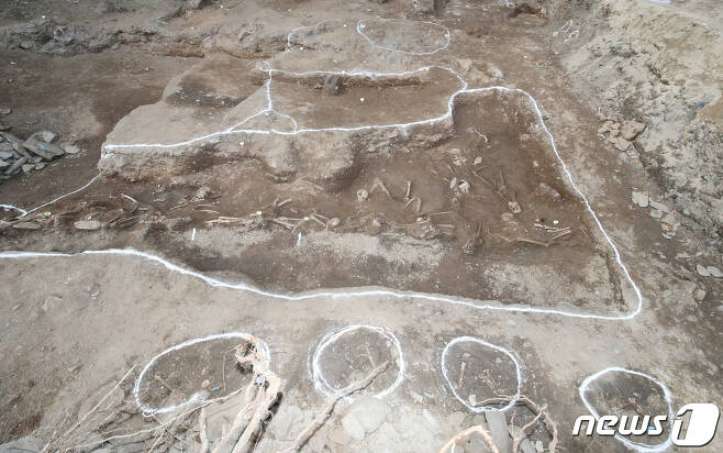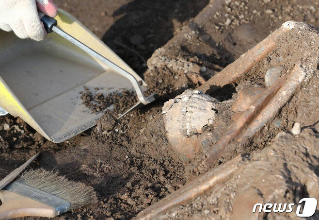13日、大田市東区(チュング)のナンウォルドンにある韓国戦争期の民間人虐殺遺骨発掘現場の様子。,遺骨発掘調査団は、この日発掘した遺骨のうち、女性の骨盤部位の骨片と未成年者のものと推定される歯を発見したと説明した。