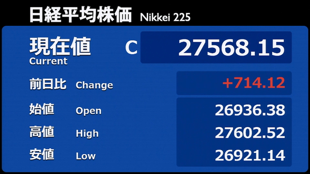 17日の東京株式市場で日経平均株価は続伸し、前日比107円69銭(0.42%)高の2万6014円62銭で終えた。終値で2万6000円を上回るのは1991年5月14日以来約29年半ぶりとなる。新型コロナウイルスのワクチン開発で景気が回復するとの観測から16日のダウ工業株30種平均が過去最高値を更新したことで、投資家が運用リスクを取る姿勢を強めた。
