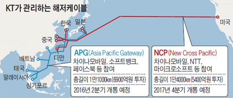 KT가 중국~한국~일본~미국을 잇는 총 길이 2만5000㎞의 해저 케이블을 주도적으로 구축하고 통합 관리까지 하게 됐다.