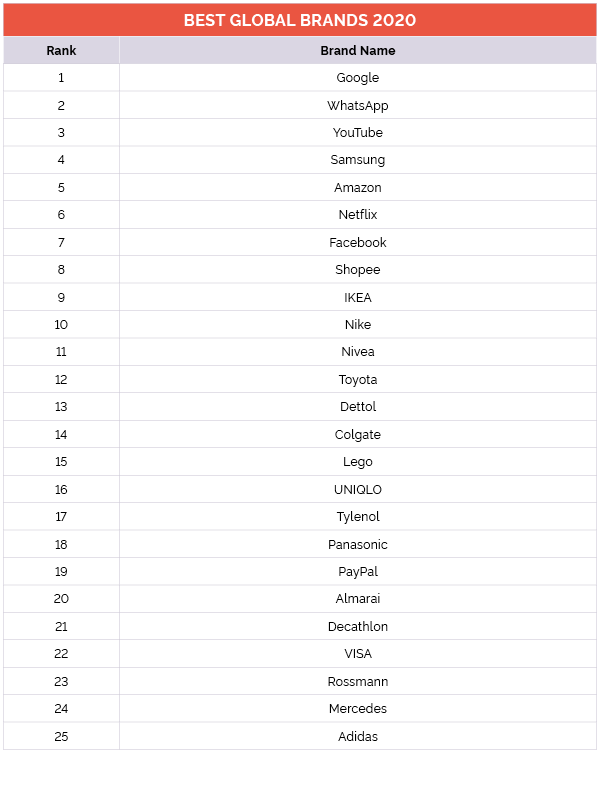 글로벌 온라인 동영상 서비스(OTT) 업체 넷플릭스 역시 지난해 10위에서 올해 6위로 4계단 상승했다. 이밖에 페이스북, 쇼피, 이케아, 나이키 등이 '톱 10'에 들었다.