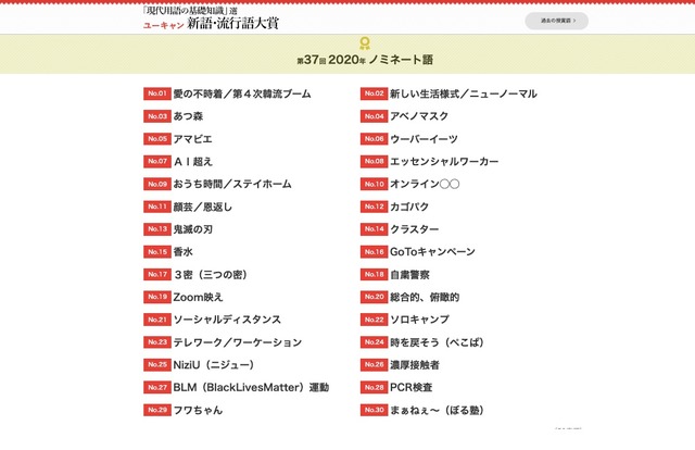 流行や世相を反映した言葉では、空前のブームを巻き起こしている「鬼滅の刃」や、ステイホーム中にハマる人が続出した人気ゲーム「あつ森」(あつまれどうぶつの森)、SNSでバズったことでブレイクした瑛人の曲「香水」、オーディション番組やプロデューサーのJ.Y.Parkが注目を集めたガールズグループ「NiziU」などが選ばれた。お笑い芸人からのノミネートは少なく、ペコパの「時を戻そう」、ぼる塾の「まぁねぇ~」の2つにとどまった今年も此の時期なんだねぇw