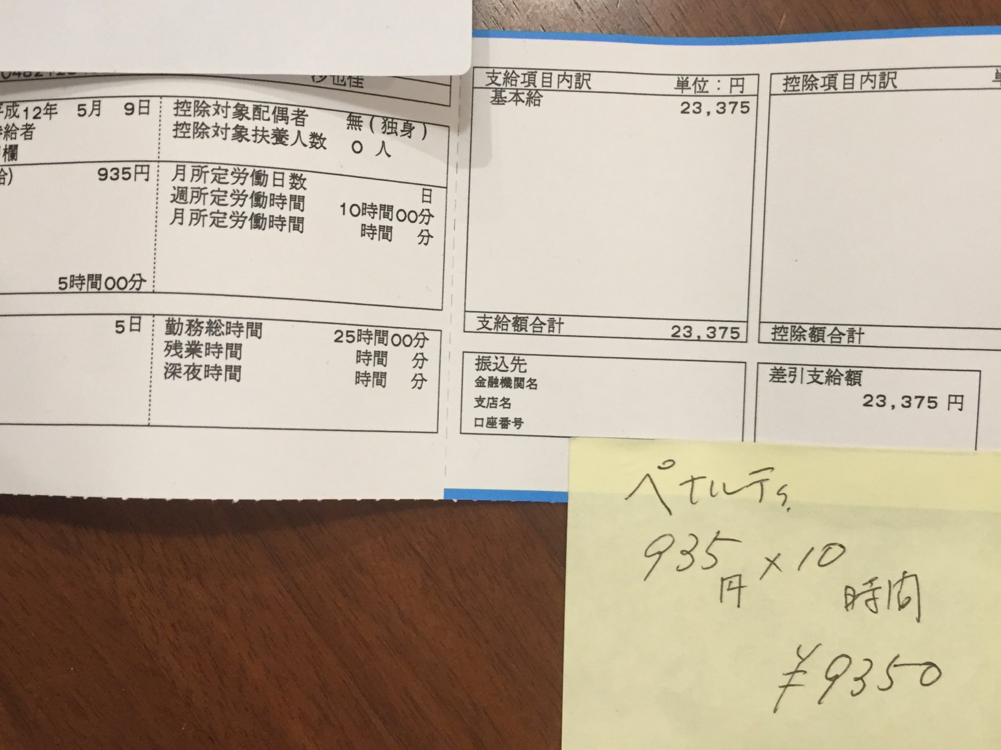 このツイートには、給与明細の添付されている。給与明細には、「勤務総時間25時間」、「支払額合計23,375」とあり、そこに添えられた付箋には「ペナルティ935円×10時間=9350円」と手書きで書かれている。