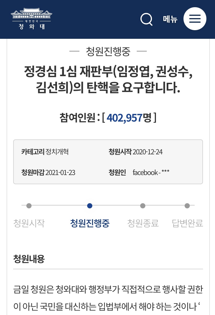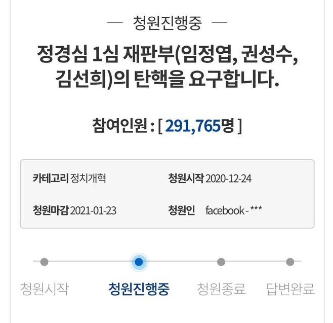 過去24日に公開された「情景芯1審裁判部(イムジョンヨプ、グォンソンス、キム・ソンヒ)の弾劾を要求します」という題の請願には「条文を適用する裁判官が良心に基づいて適切に判断をしたのか、国民は知ることができない司法にに対する不信が生じる」と書かれている。