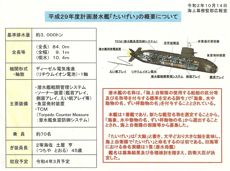 海自によると、たいげいは基準排水量3千トンで全長84メートル、全幅9.1メートル。乗員は約70人。建造費は約800億円。「大きな鯨」が名称の由来となっている。