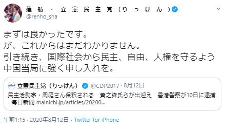 蔡氏は、台湾が独裁体制から民主主義に移行する過程で奮闘したことに触れて「香港人も心に秘めた理想を忘れてはいけない。まだ絶望する時ではない」と呼び掛け、台湾は民主化を目指す香港人を支援するとエールを送った。(共同)香港の抗議デモをめぐる裁判で2日、実刑判決を受けた民主活動家の周庭さんが判決を不服として控訴を申請しました。