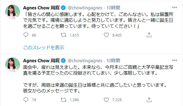先月23日、黄之鋒は「当局は私を獄中に留めておきたいのかもしれない。しかし収監や選挙の禁止、その他の恣意的な権力によって我々の活動は止められない。私たちは今、自由の価値を世界に示そうとしている」、周庭は「私は近い将来、人生で初めて刑務所に入るかもしれない。判決も含め、今後のことに大きな不安を感じている。でも私たちより犠牲を払っている仲間がいることを忘れないで欲しい」とコメント。