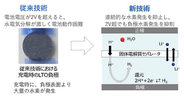 今回東芝が開発した水系リチウムイオン二次電池は、負極に黒鉛ではなく燃えないリチウムチタン酸化物(LTO)を採用。加えて、安全性をより高めるため、外部要因で火災が起きた際の安全性にも考慮し、電解液に不燃性水溶液を採用した。
