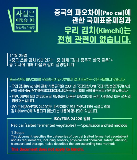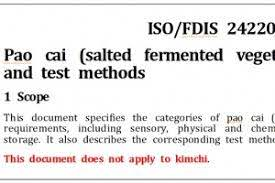 ISO 문서(ISO/FDIS 24220)도 파오차이로 명시하면서 해당 식품규격이 김치에 적용되지 않는다는 내용이 명시되어 있습니다.