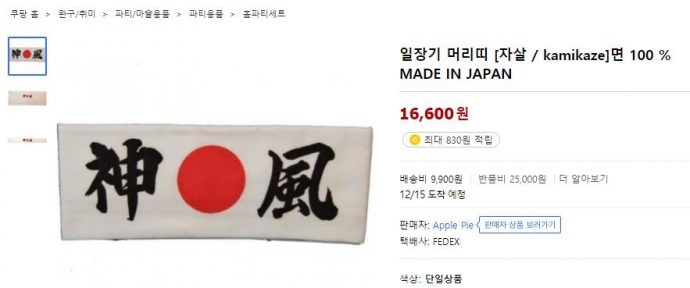 2020年12月2日、韓国・MBNによると、2021年度大学就学能力試験(日本のセンター試験に相当)を3日に控えた韓国で、インターネット通販大手「クーパン」が日本の「神風」関連の商品を販売して物議を醸している。