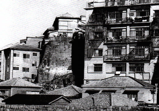 (↓写真1)岸壁近くにある木造住宅のうち3軒が女郎屋。昭和25年頃の写真で、すでに洋品店に衣替えしているが、右端に写る大きめの住宅が、朝鮮人専用の「遊郭吉田」だった。