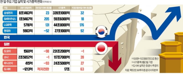 삼성전자의 2분기 영업이익은 작년 같은 기간보다 23% 늘었다. SK하이닉스의 이익 증가율은 205%에 달했다. 현대차가 가장 부진했다. 52% 줄었다. 하지만 이마저 일본 경쟁 업체들을 압도한다. 도요타의 이익은 98% 급감했고 혼다는 적자를 낸 것으로 추정된다. LG화학이 파나소닉을 추월한 것은 인상적이다. 파나소닉은 작년 상반기까지 세계 전기자동차 배터리 시장 1위였다. 하지만 올 2분기 영업이익은 415억원에 그쳤다. 전년 대비 93%나 줄었다. LG화학은 공격적인 영토 확장으로 전기차 배터리 1위 자리를 차지했다. 이익은 131% 급증했다. 시가총액도 역전했다. LG화학 시가총액은 6일 48조원을 넘어섰다. 저점이던 지난 3월 19일엔 16조2000억원이었다. 같은 기간 파나소닉 시총은 19조3000억원에서 25조원으로 늘어나는 데 그쳤다.