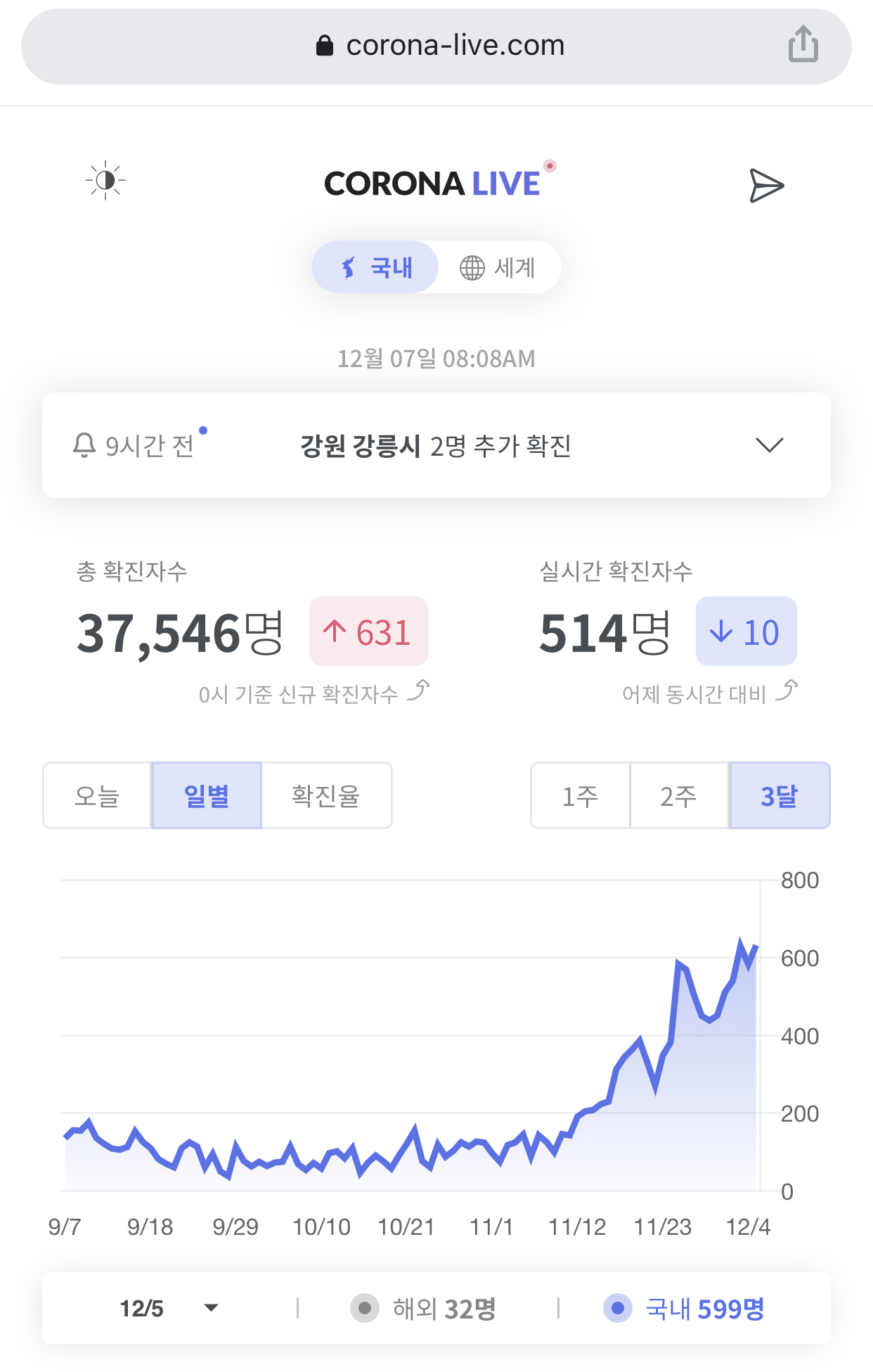 12日0時基準で韓国の一日の新型コロナ新規感染者が950人(国内地域社会928人、海外入国22人)となった。一日の新規発生者数が1000人を超える勢いだ。本格的な第3波が始まった。