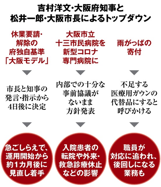 維新コンビの失態の根源は、橋下府政から続く医療軽視に行き着く。公立病院の統廃合を進め、住吉市民病院を閉鎖。関西で学生数トップを誇っていた大阪府医師会看護専門学校を府市からの補助金削減によって閉鎖に追い込み、感染症病床数の削減、保健所の職員リストラを断行してきた。>>5