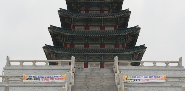 仏国寺の青雲橋・白雲橋をかたどった国立民俗博物館(ソウル市鍾路区)の石段のあちこちに11月18日、このような文章が書かれた全国民主労働組合総連盟(民労総)の横断幕が掲げられていた。この石段は入場者たちの写真撮影スポットだ。