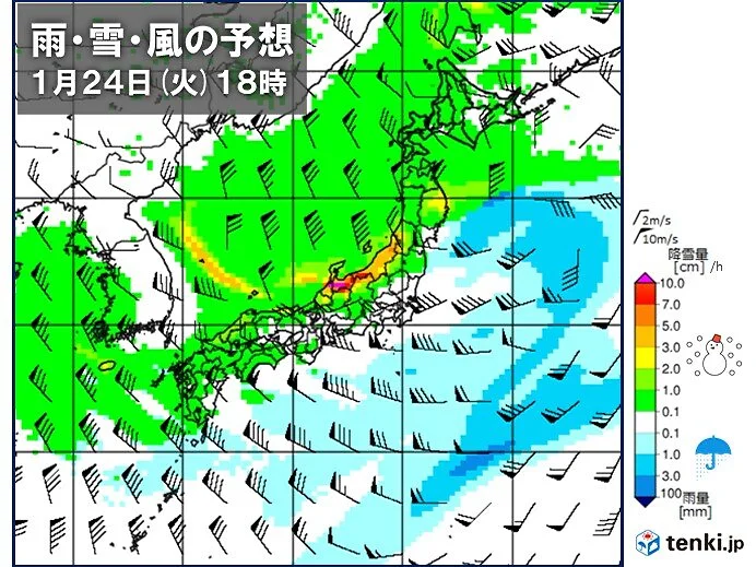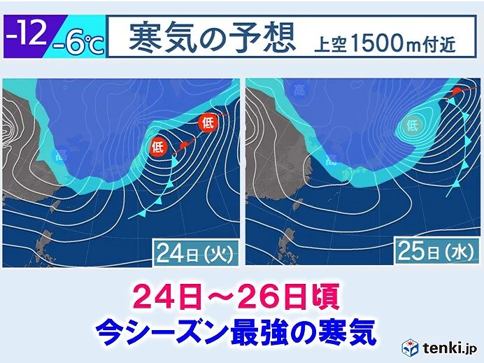 24日(火)から日本列島に、この冬一番の強烈な寒気が流れ込むでしょう。今のところ、寒気の底は西日本では24日(火)頃、東日本や北日本は25日(水)頃になる予想です。上空1500メートル付近でマイナス12℃以下(平地で大雪になる目安)の強烈な寒気が、24日(火)の夜には西日本をすっぽりと覆い、25日(水)には関東付近にも流れ込むでしょう。