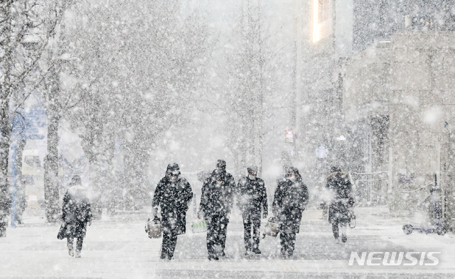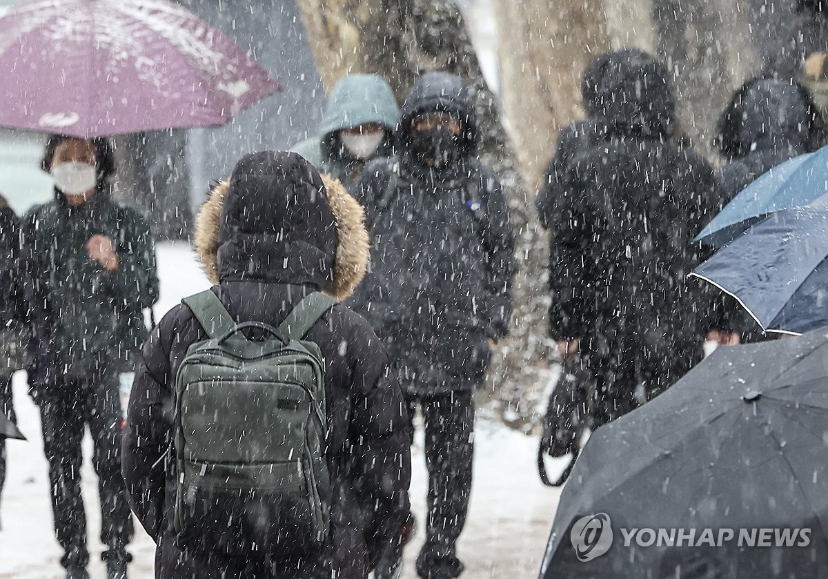 韓国のソウル全域に大雪注意報が出ている。雪が降る中、市内の地下鉄駅付近を行き交う市民=9日、ソウルいちいち、日本を気にするな
