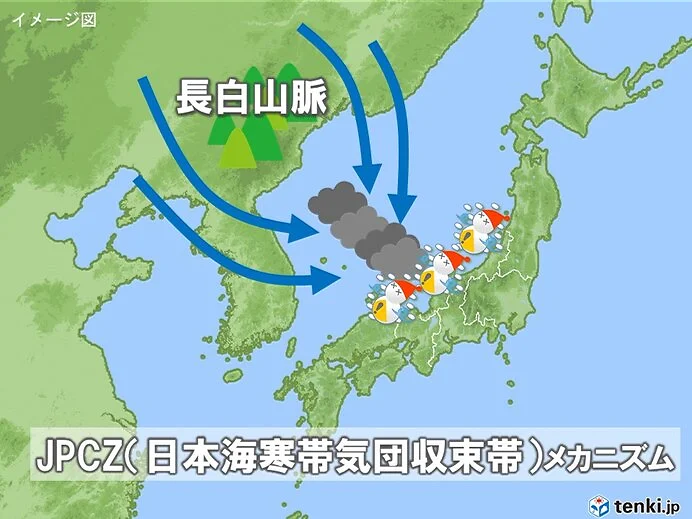 冬型の気圧配置が強まると、シベリア大陸から冷たい風(寒気)が日本海に流れ込みます。この冷たい風(寒気)は、中国と朝鮮半島の境界付近にある長白山脈(最高峰:白頭山2744メートル)により二分され、その風下(日本海)で再びぶつかり収束帯(雪雲が発達しやすいライン)が形成、雪雲が発達しやすくなります。