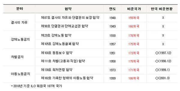 한국 정부는 핵심협약 중 차별금지(또는 균등대우)와 아동노동금지 2분야의 4개 협약만 비준을 한 상태다. 결사의 자유와 강제노동금지에 관한 4개 협약은 아직 비준을 하지 않은 상황이다.