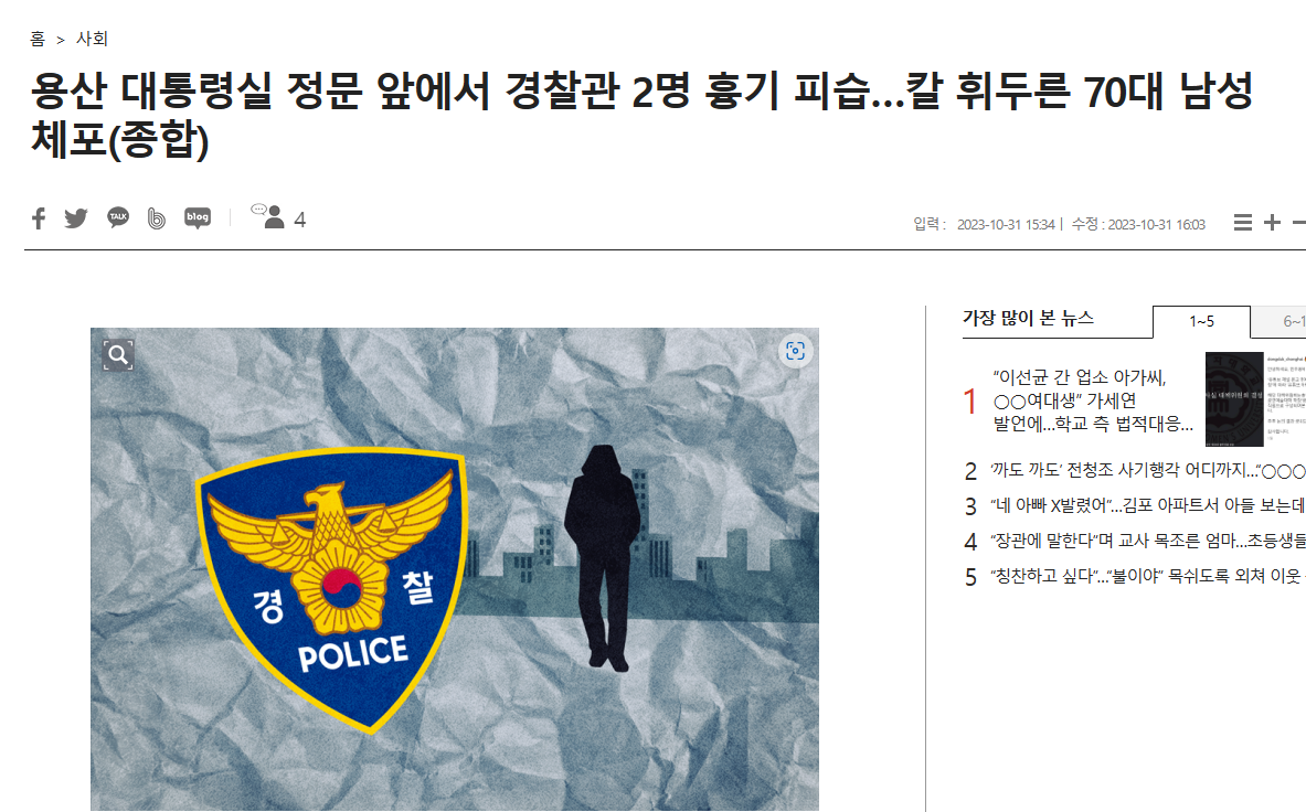 龍山大統領室正門前で警察官2人を凶器で襲撃···刀を振り回した70代の男性逮捕(総合)>>1