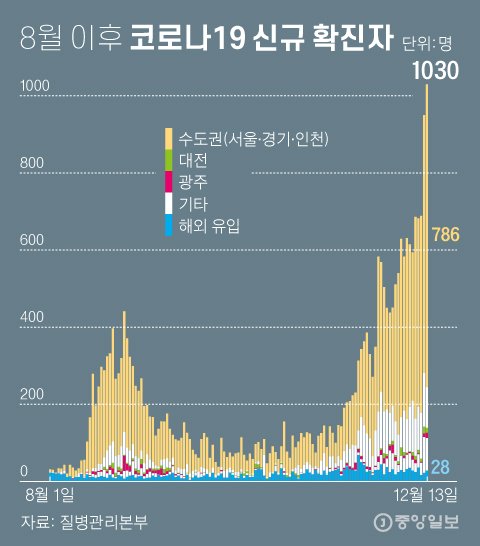 疾病管理庁中央防疫対策本部が13日に明らかにしたところによると、この日午前0時基準新規患者は1030人増え、これまでの累積患者は4万2766人になった。新規患者のうち国内発生が1002人で97.3%を占めた。本格的な第3波に入ったと分析される。地域別に見ると、ソウルが396人、京畿道(キョンギド)が328人、仁川(インチョン)が62人と首都圏だけで786人出てきた。