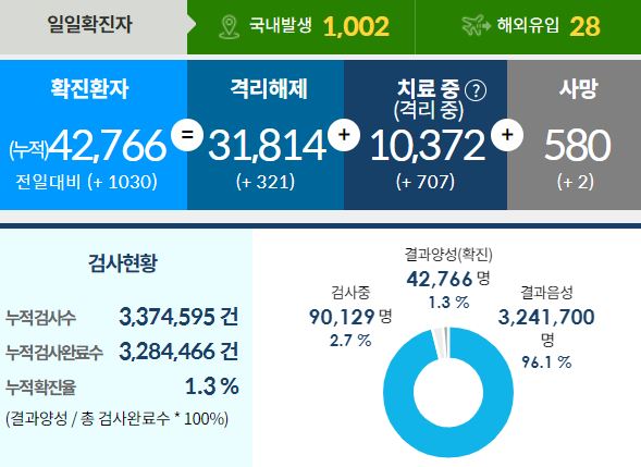 今日発表された国内コロナ19の新規確定者は1,030人で、初めて千人を超えました。