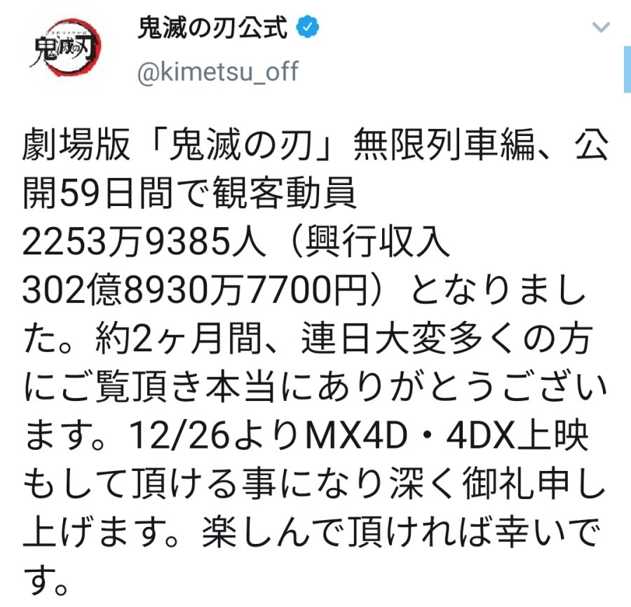 > 公開中のアニメ映画「劇場版『鬼滅の刃』無限列車編」の興行収入が27日までに、約324億7900万円を記録し、国内の興行収入ランキングで、「千と千尋の神隠し」(2001年公開、316億8000万円)を19年ぶりに抜いて、歴代1位となった。配給する東宝とアニプレックスが28日、発表した。映画『銀魂』、V12『鬼滅の刃』抑え動員1位 3ヶ月ぶりにランキング首位交代