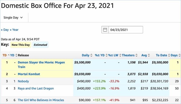 1位『鬼滅の刃 無限列車編』推定186万ドル