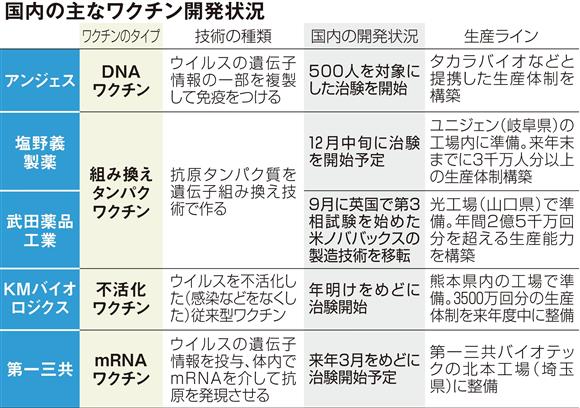 国内のワクチン開発ではすでに製薬ベンチャーのアンジェスが、治験に着手。今月までに偽薬を用いてワクチンの安全性、有効性を確かめる第2、3相の試験にこぎつけている。このほか、mRNAワクチンの開発を進める第一三共は来年3月に、不活化ワクチンを開発するKMバイオロジクスは年明けにも治験を開始する方針だ。