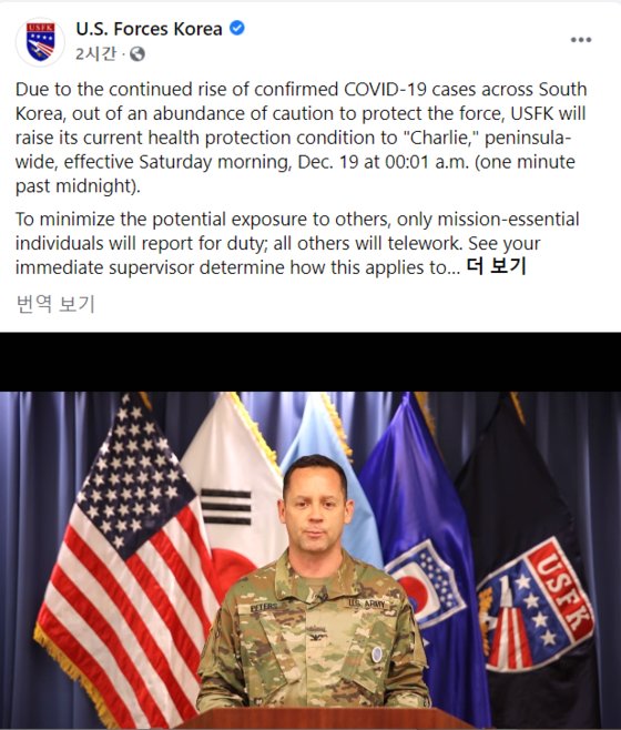 在韓米軍は16日、フェイスブックを通じて「19日0時から韓国国内のすべての地域に対する公衆保健防護態勢(HPCON)段階を『チャーリー』に引き上げる予定」と明らかにした。