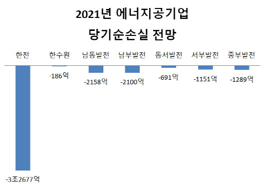 12일 기획재정부가 국회에 제출한 `2021~2025년 공공기관 중장기 재무관리계획`에 따르면, 한전(015760)과 한전 자회사인 발전사 6곳(남동·남부·중부·서부·동서발전 및 한국수력원자력)의 올해 당기순손실이 4조252억원에 달할 전망이다. 이는 이들 공기업이 자체적으로 추산한 재무 전망을 집계한 것이다.