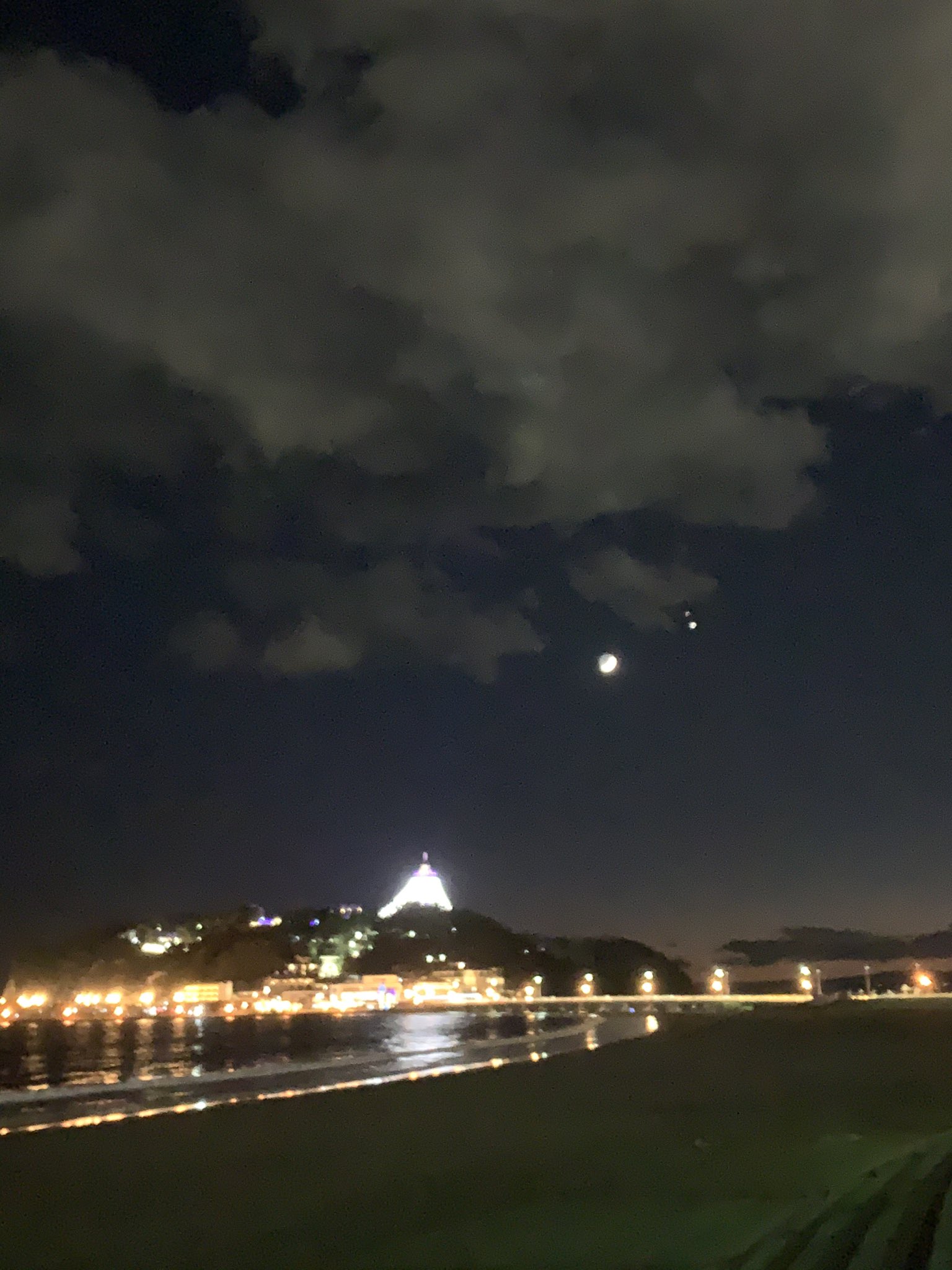 冬の夜空で、木星と土星が大接近している。約400年ぶりという非常に珍しい天体現象でファンの注目を集めている。17日の京都市内は雲が多かったが、日没後に南西の空低く、接近した明るい二つの惑星と近くの細い月が美しさを競い合うような神秘的な様子が見られた。