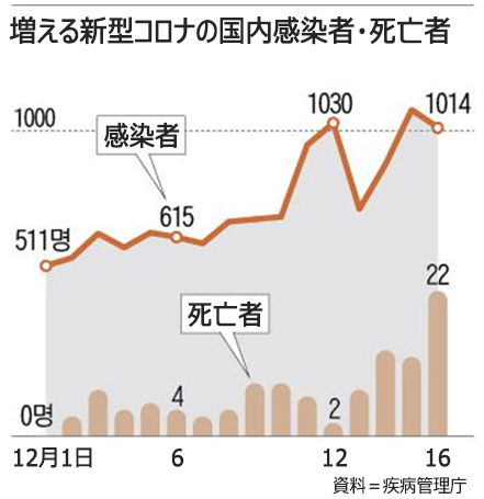 14日に死亡者が13人発生し、新興宗教団体「新天地イエス教証しの幕屋聖殿」大邱教会から広がった流行「第1波」時の3月24日(9人)という直近の最多死亡者数を上回ったが、さらに15日(12人)、16日(22人)と三日連続で死亡者数が2けたとなった。今月1日から16日までの死亡者は108人で、先月の同期間(11月1日から16日まで・28人)の3.9倍に達した。