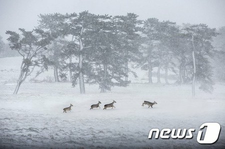 チェジュ(済州)島の雪原を走るノロジカの姿が収められた写真作品「雪原のノロジカの散歩」