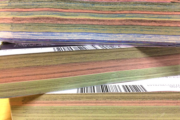 週刊誌や漫画雑誌の紙と同じ原理だね、古紙を溶かしてインクを混ぜて再利用