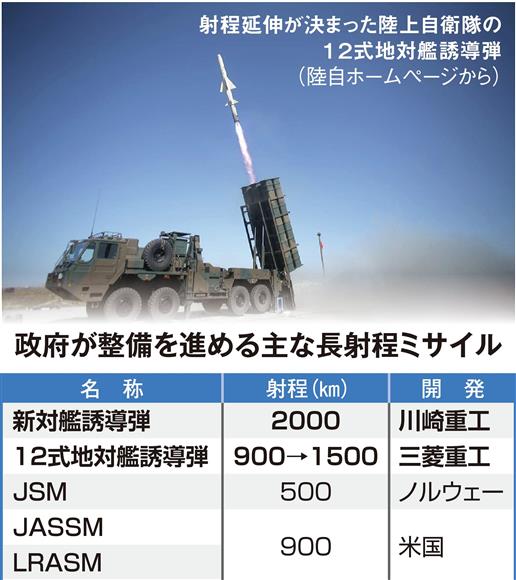 政府は平成29年にF35戦闘機に搭載するノルウェー製の「JSM」(射程500キロ)と、F15戦闘機に搭載する米国製の「JASSM」「LRASM」(ともに射程900キロ)の取得を決めた。新型の対艦誘導弾と12式の射程はこれらを大幅に上回り、射程1600キロ以上とされる米国の巡航ミサイル「トマホーク」にも匹敵する。(以下省略)