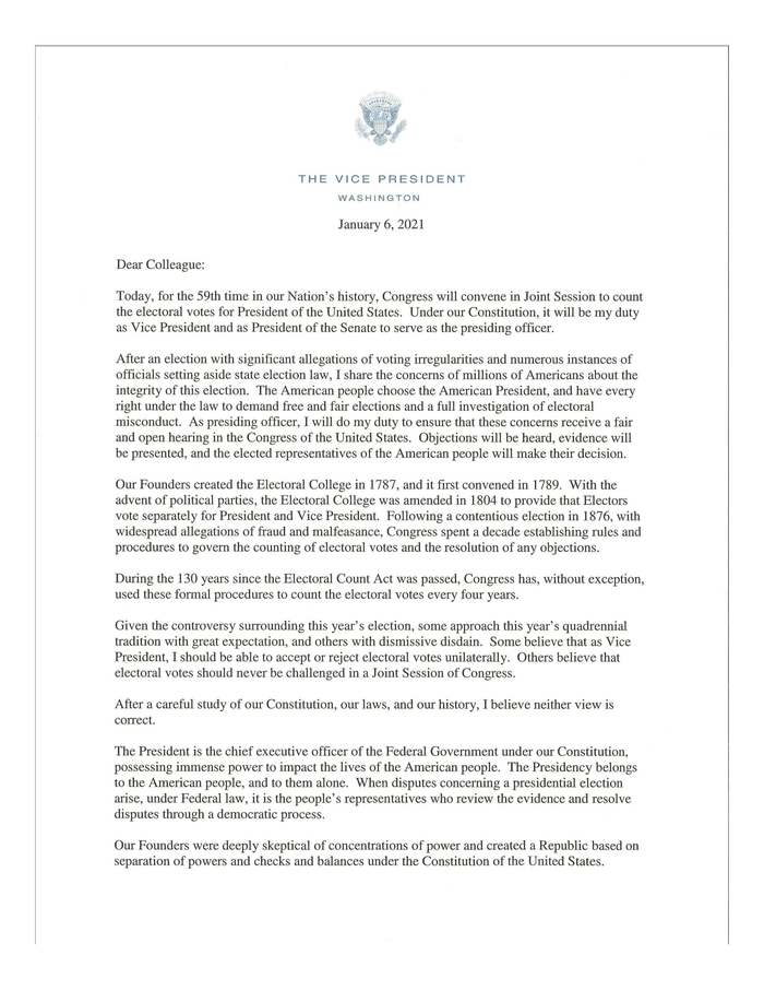 ペンスは、トランプがまさにそれを行うことができたと主張した後、「一方的に選挙人票を受け入れるか拒否することができるはずだ」という考えを拒否し、議会が「選挙人票に異議を唱えるべきではない」という考えに反対した。