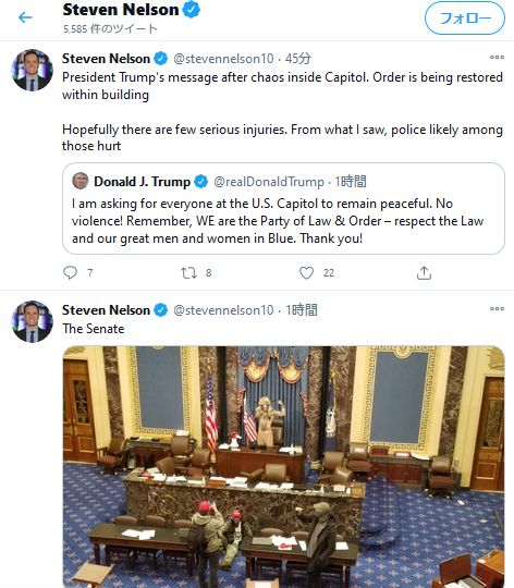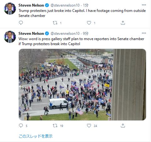 報道によると、ペンス副大統領は討議が行われていた上院を退出した。またCNNによると、大統領支持者に対し催涙弾が使用されている。