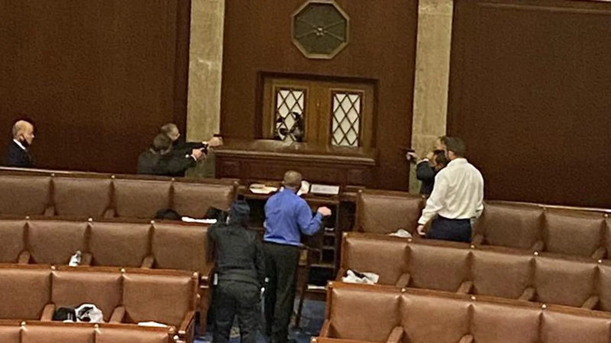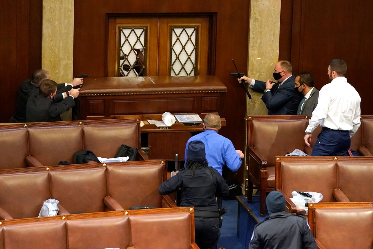 ドナルド・トランプの支持者が2020年の選挙の結果を覆そうとして国会議事堂の建物を襲撃した後、国会議事堂警察は下院の部屋の床に銃を引きました。