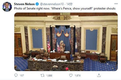 選挙人団の認定が停止されたため、マイク・ペンス副大統領が上院室から引き離された。