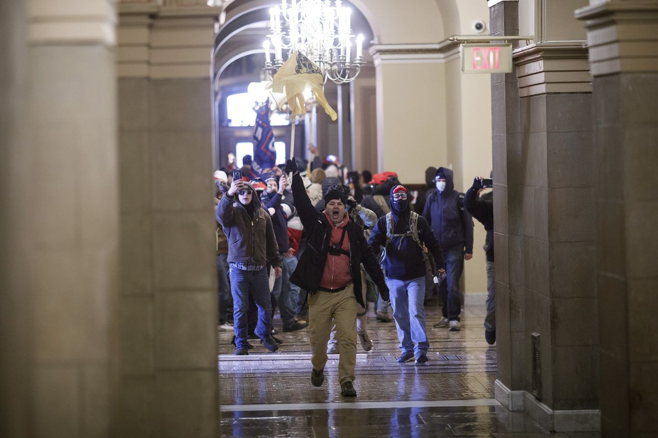 私たちが聞いていること:抗議者たちは、下院と上院を隔てる国会議事堂の彫像ホールを通り抜け、両側に米国旗とMAGA旗を掲げました。
