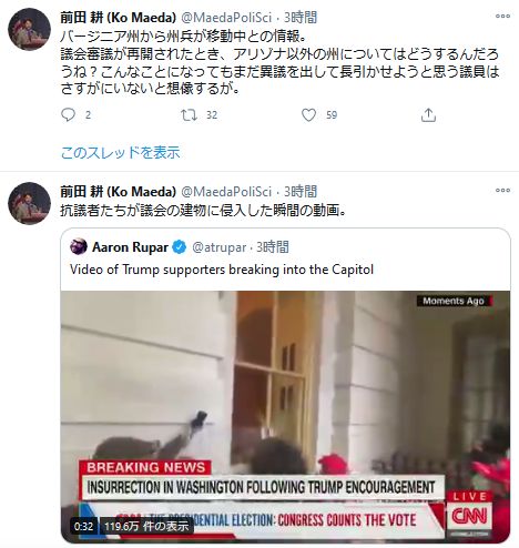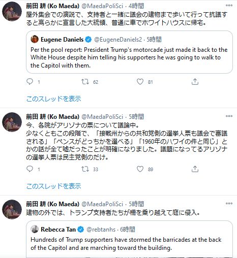 副大統領はさらに、「平和的な抗議はすべてのアメリカ人の権利だが、この国の議事堂へのこのような攻撃は、容認しない。関係者は法の限りにおいて起訴する」と警告した。