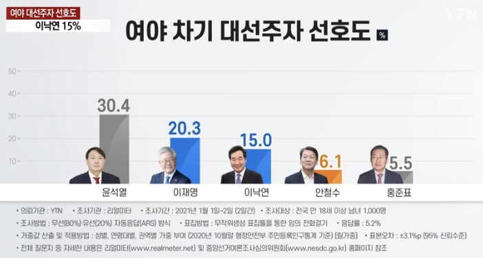 YTN(リアルメーター調査)が新年に2日間実施した与野党次期大統領選候補好感度調査で、尹錫烈(ユン·ソクヨル)検察総長が30.4%で1位を占めました。
