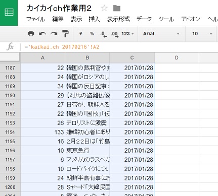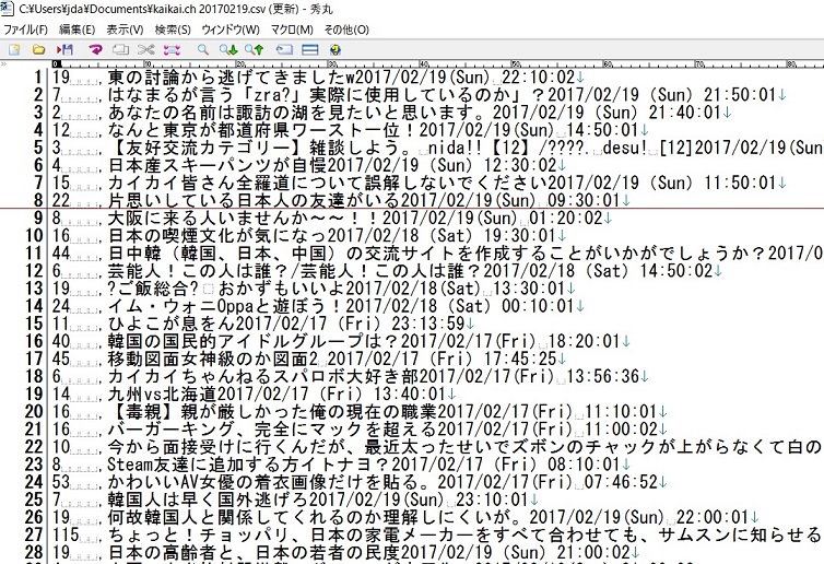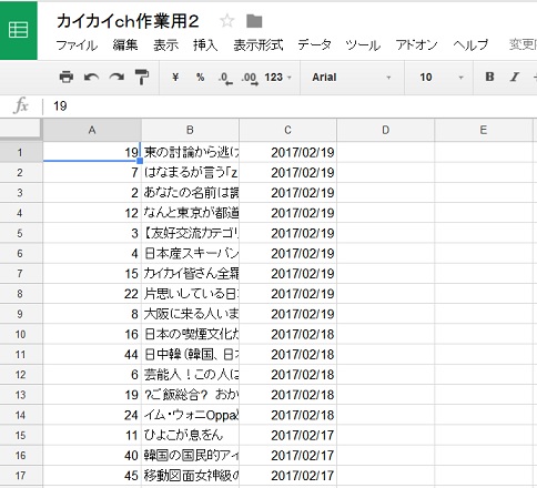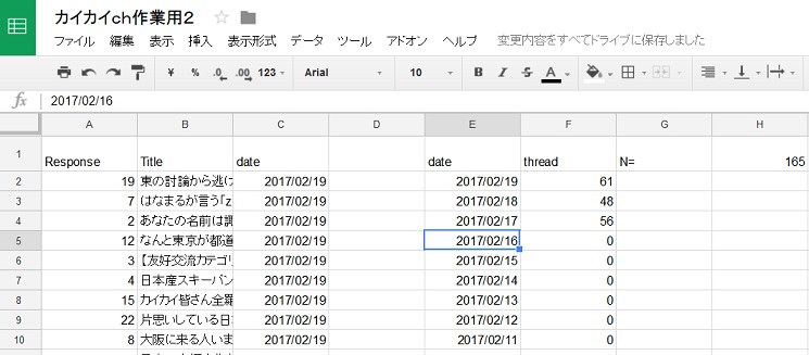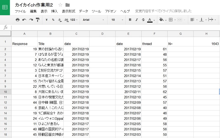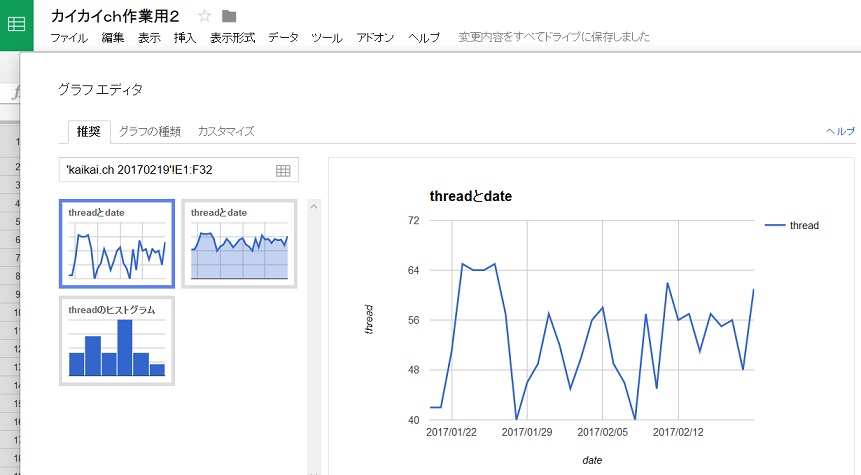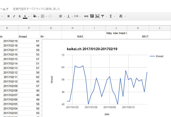 「新規に作成されたスレッドの一覧」から、データをコピー・アンド・ペーストして、プログラミング用のエディタに、貼り付けて、マクロで整形をして、CSV形式に変換したのちに、グーグルドライブのスプレッドシートにインポートをして、過去データとマージ後に、スプレッドシートのグラフ作成機能で作成をしています。nida。