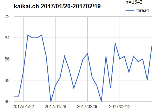 2日おきの、新規スレッドの作成数のグラフ作成を昨日、忘れていて、今日は3日分になってしまった。w。nida。