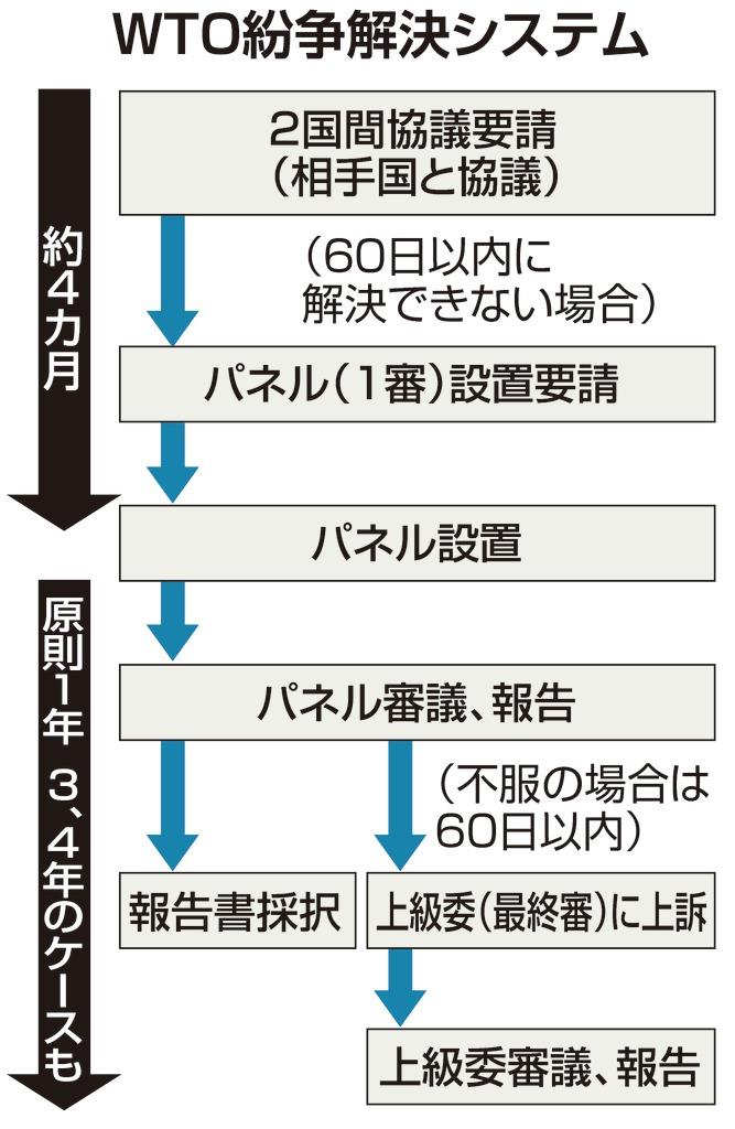 日本が2018年に韓国をWTO提訴。パネルは20年11月に日本勝訴の判断を示した。日本は25日に開かれたWTOの会合で、韓国の上訴を批判した。