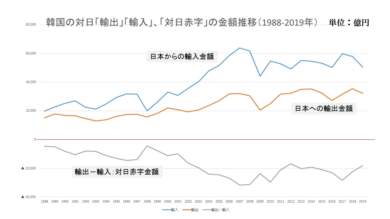 以下のグラフは、1988-2019年の日本への輸出、日本からの輸入、「『輸出 – 輸入』の赤字金額」をプロットしたものです。