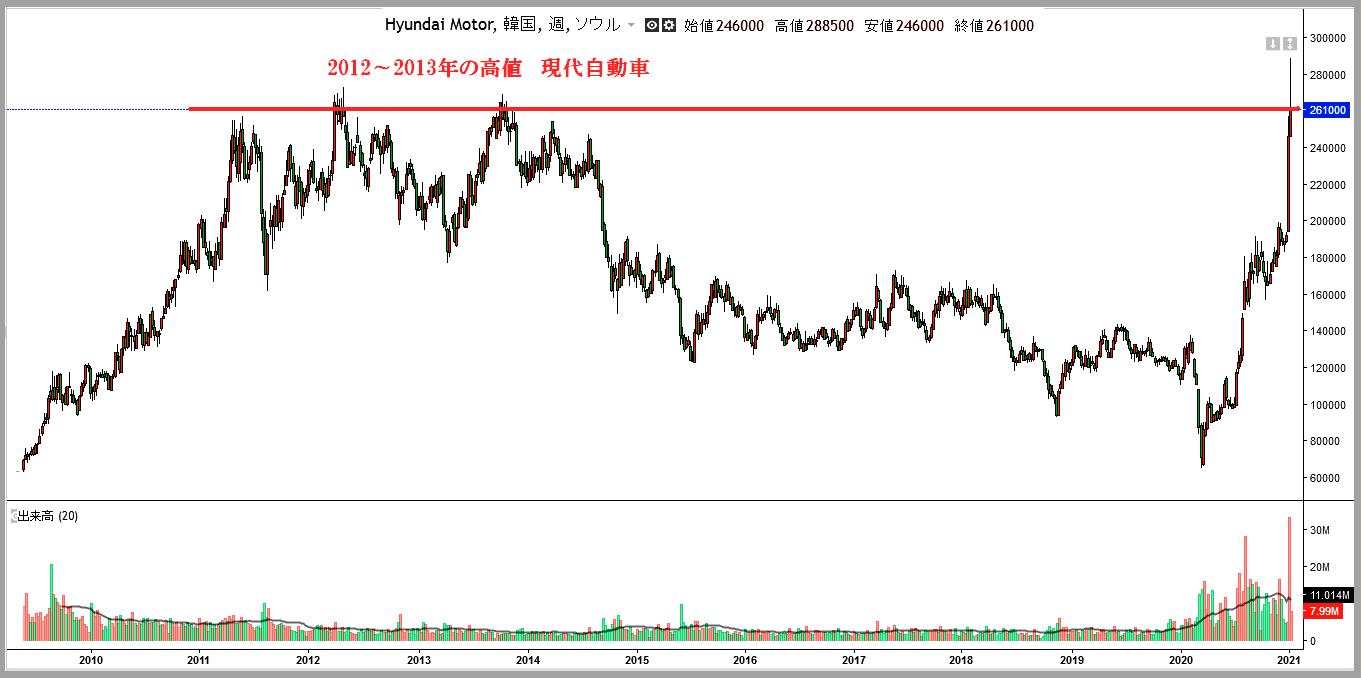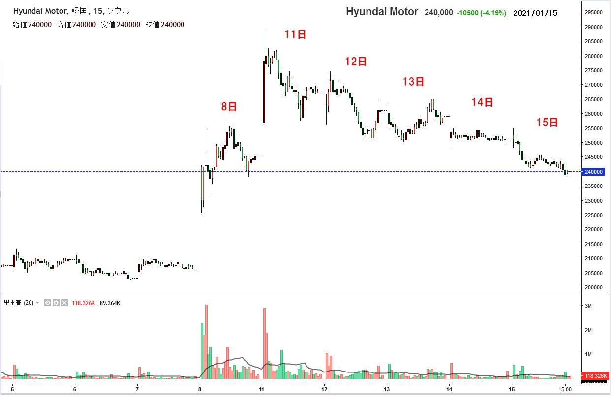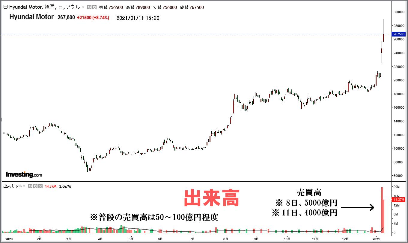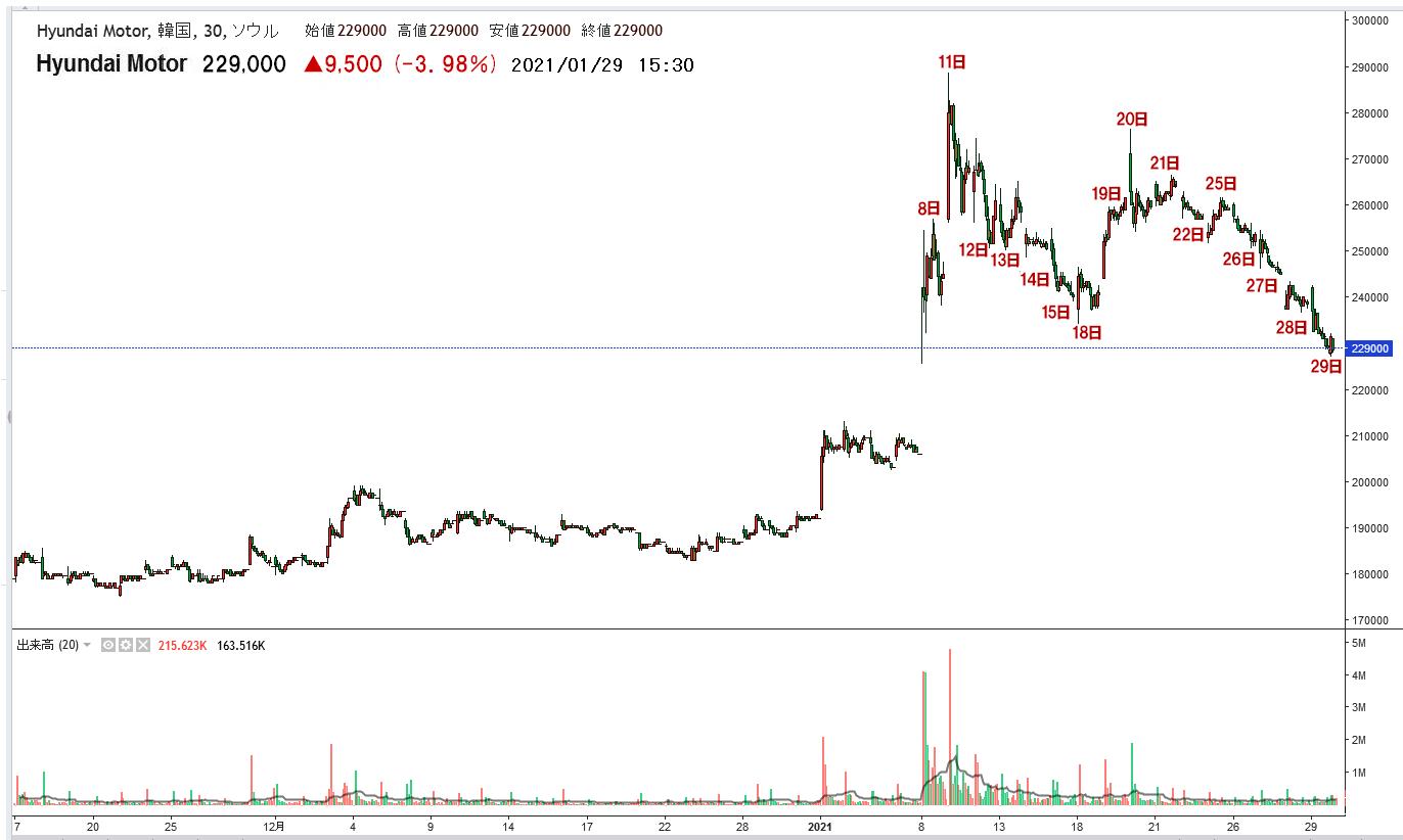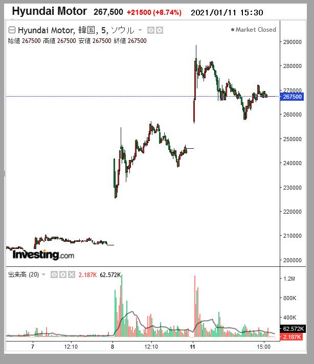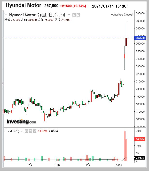 アップルと自働運転EV車の共同開発というニュースで現代車株価が急上昇 2021-01-08