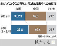 SKハイニックスは昨年1-9月の半導体売り上げの40.4%を中国で上げた。同じ期間に米国の割合は37.8%だった。一昨年は中国が46.6%、米国が30.2%だった。米中は売り上げの約80%を占める得意先だ。サムスン電子は地域別の販売割合を公表していないが、程度の差こそあれ、米中への依存度が高いのは同じだ。両国を除くと、国内はもちろん、日本や欧州など他地域を合わせても20%前後だ。